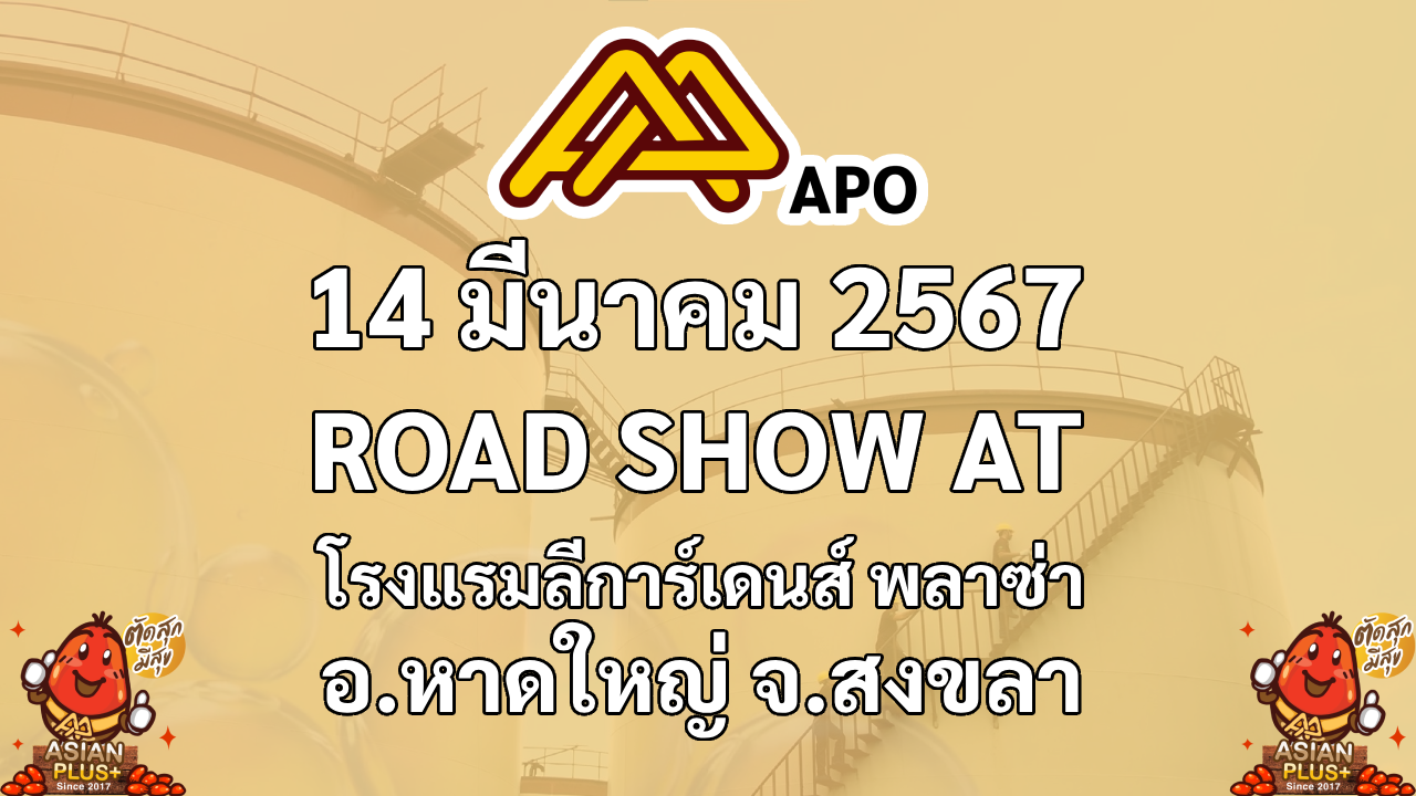 14 มีนาคม 2567 โรงแรมลีการ์เดนส์ พลาซ่า อ.หาดใหญ่ จ.สงขลา บริษัท เอเชียนน้ำมันปาล์ม จำกัด (มหาชน) เดินหน้าให้ข้อมูลนักลงทุน 5 จังหวัด โชว์ศักยภาพธุรกิจ โอกาสเติบโตสูง โดยมีแผนการ ROAD SHOW ดังต่อไปนี้